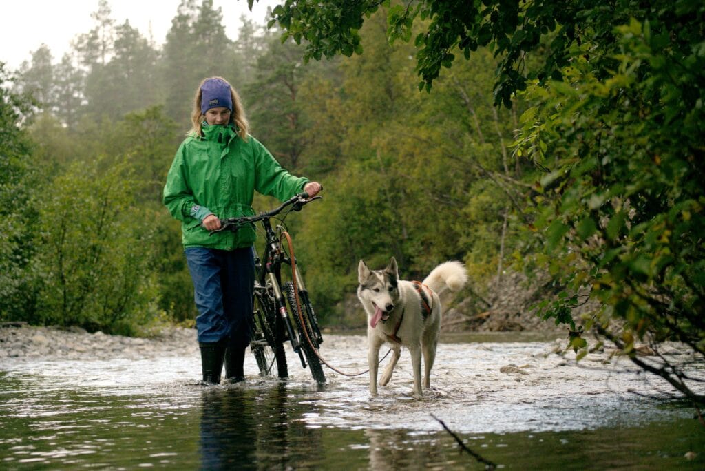 Mit dem Rad und Husky im Zuggeschirr flott durch Waldwege, Bachquerungen und am Seeufer entlang.