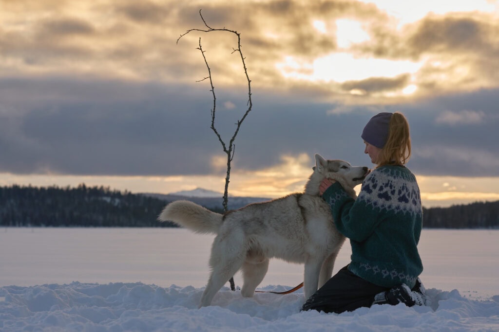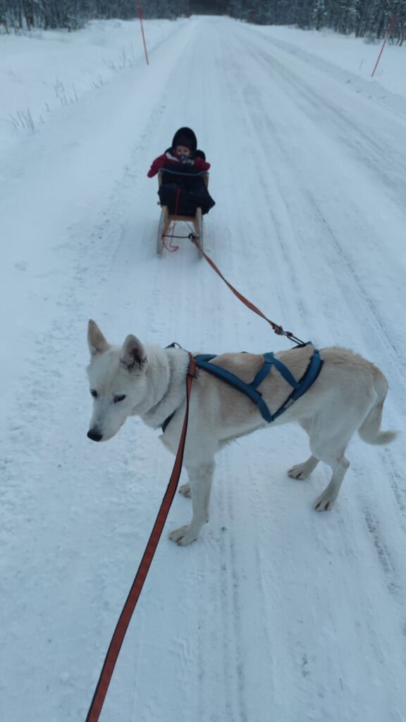 Das Kind sitzt auf dem Schlitten, der mit einem Gummiseil am Geschirr des Hundes vor dem Schlitten befestigt ist. Eine weitere kurze Leine ist am Halsband des Hundes befestigt, das von einem Elternteil gehalten wird. Der Elternteil geht mit dem Hund spazieren und „führt“ ihn, der fleißig den Schlitten mit dem Kind zieht. Nach der Schlittentour auf dem zugefrorenen See oder den verschneiten Straßen können Sie sich auf der Huskyfarm am Feuer aufwärmen, lokale Köstlichkeiten essen, unsere anderen Huskys treffen oder sogar auf den Schlitten (ohne Hund) den Hang hinunterrutschen… Schenken Sie Ihrem Kind ein Winterabenteuer in der Arktis mit echten Schlittenhunden, an das es sich sicher erinnern wird.