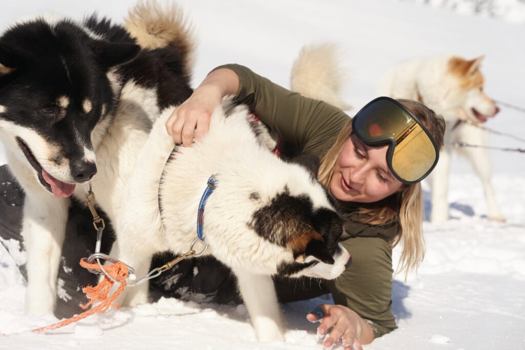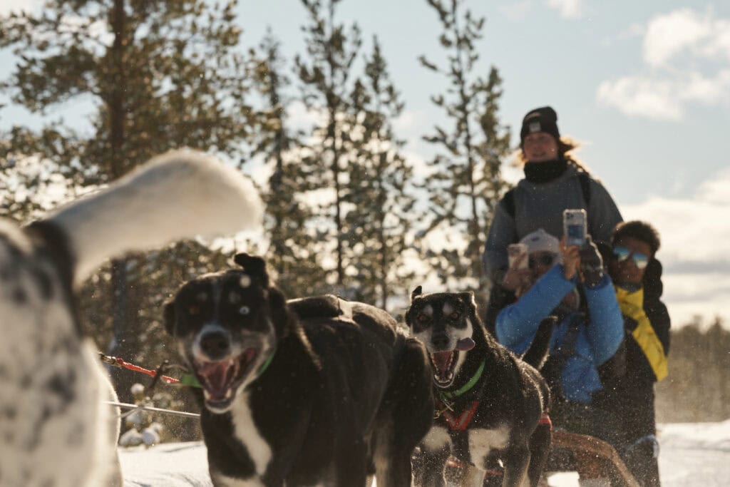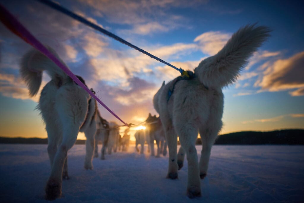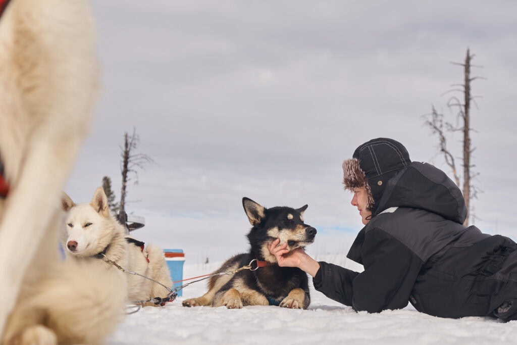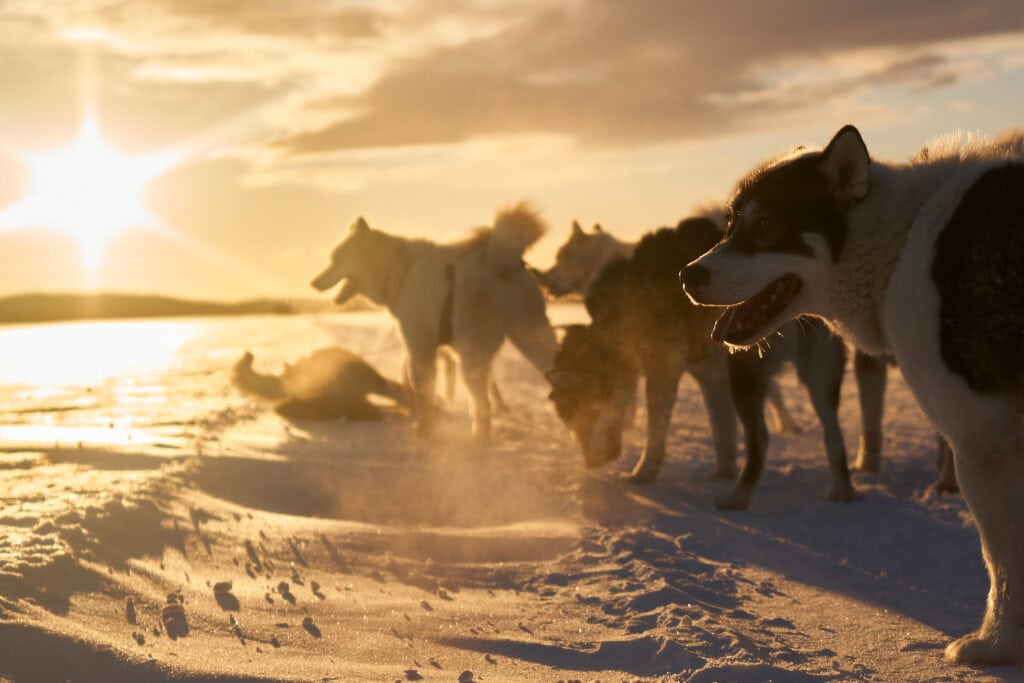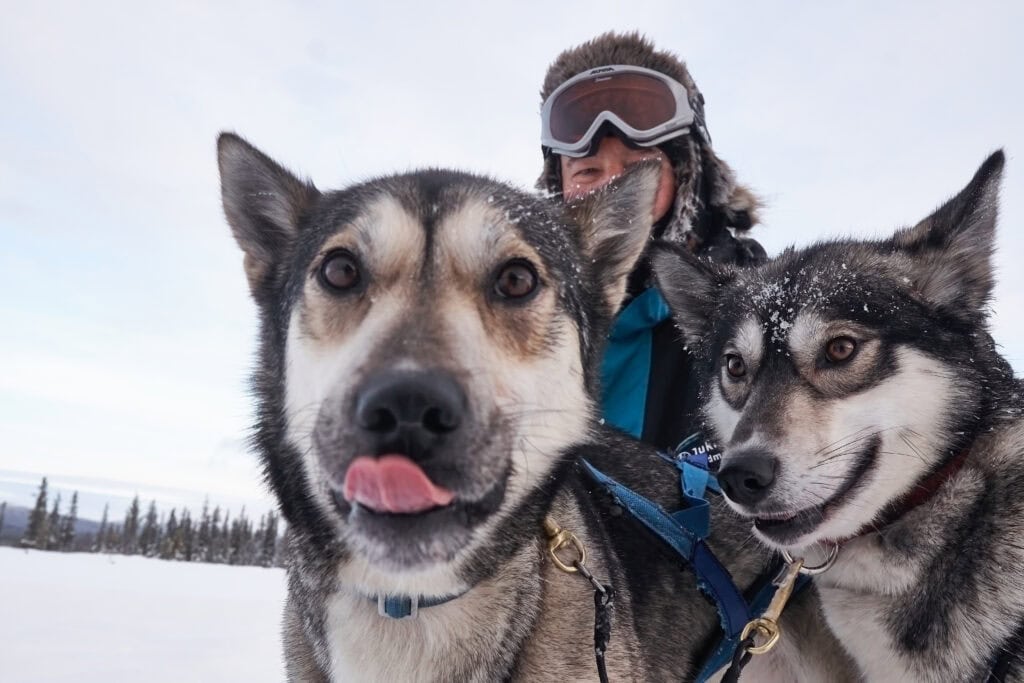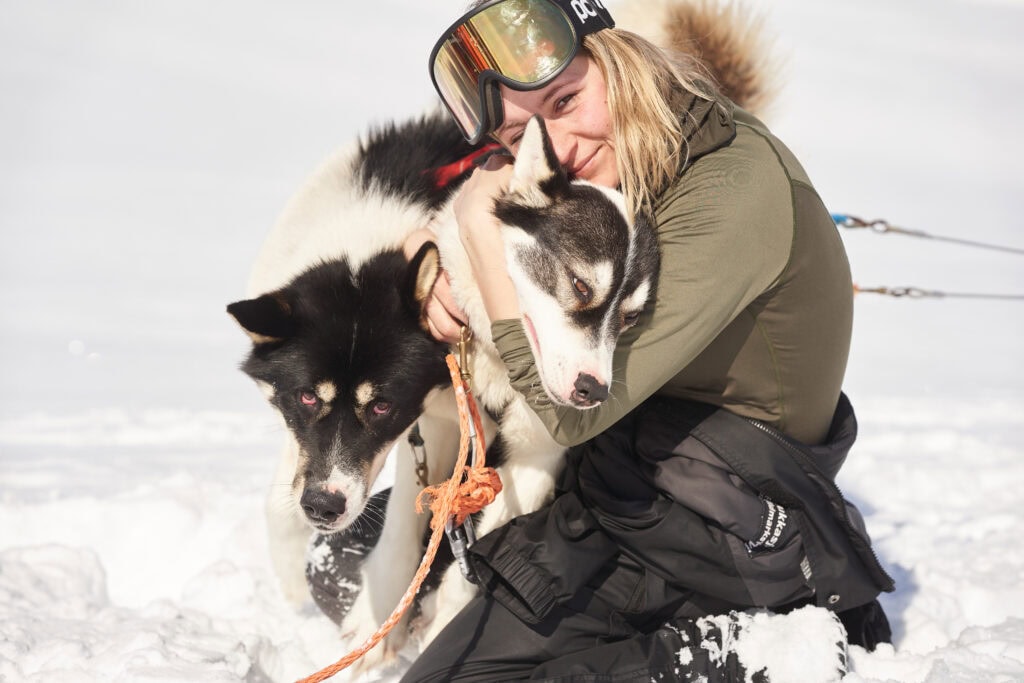 Wir fahren gemächlich durch bewaldetes Gelände entlang eines Flusses – mit Blick auf die Berge – oder über einen etwa 5 km langen zugefrorenen See. Ein Team von 10–14 Hunden zieht Ihren Schlitten; pro Schlitten können bis zu vier Personen mitfahren. Auf halber Strecke machen wir eine Pause: Zeit, die Hunde zu knuddeln, am Feuer Tee, Kaffee oder heiße Schokolade zu trinken und Brot mit geschmolzenem Käse und Butter zu genießen. Am Ende der Tour bekommen die Hunde einen Snack und viele Streicheleinheiten.