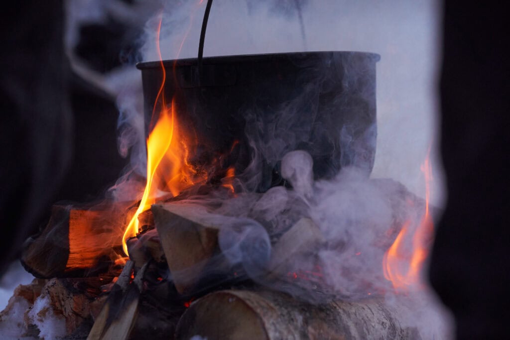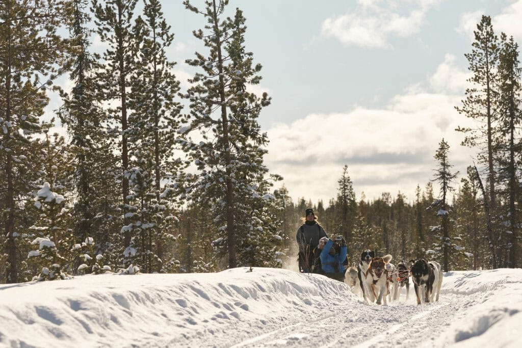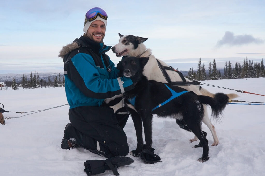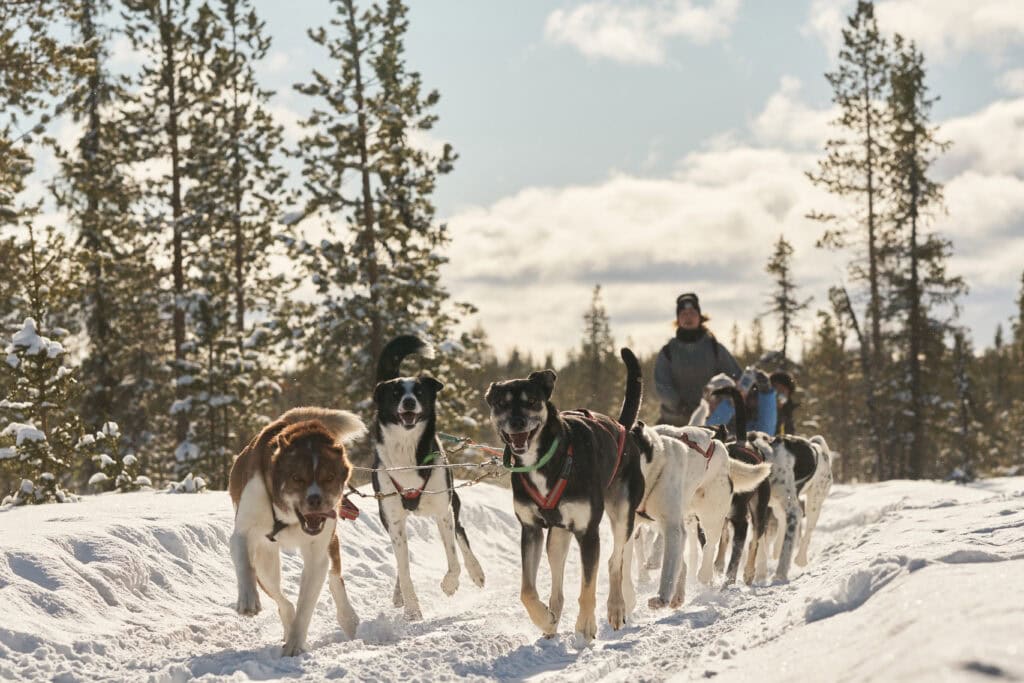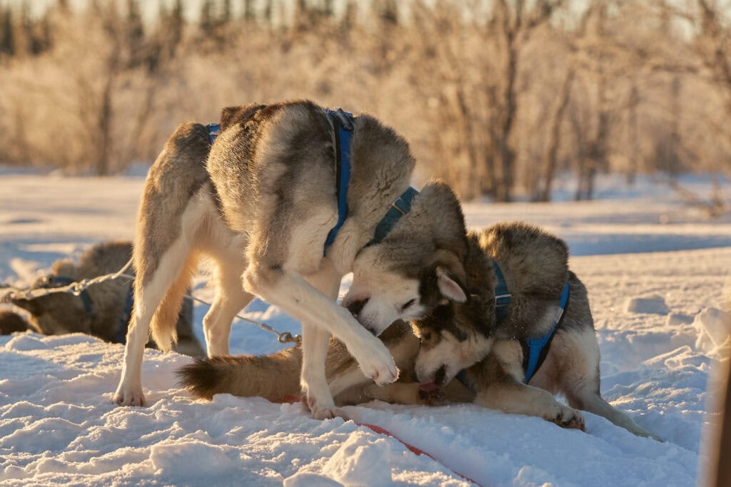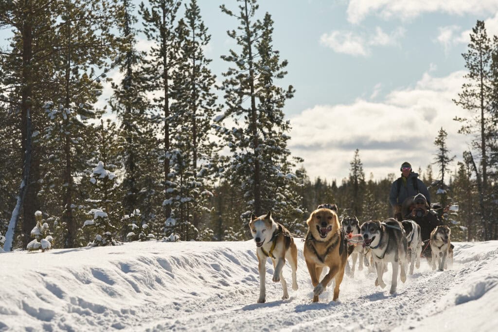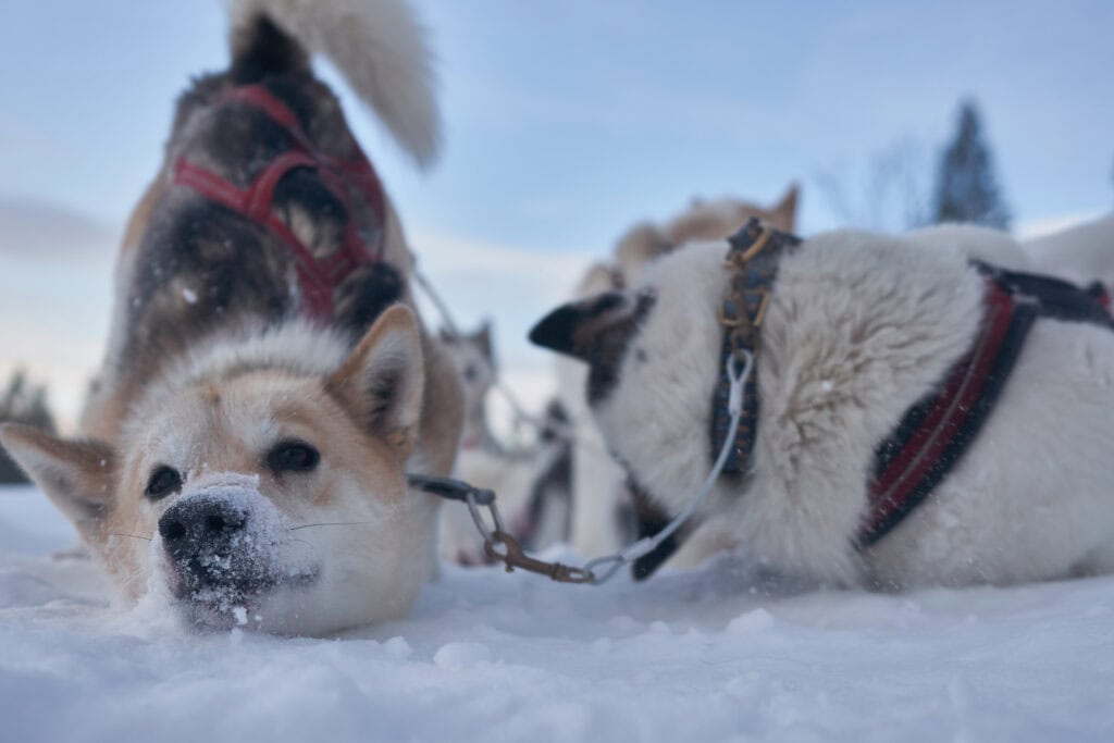 Wir fahren gemächlich durch bewaldetes Gelände entlang eines Flusses – mit Blick auf die Berge – oder über einen etwa 5 km langen zugefrorenen See. Ein Team von 10–14 Hunden zieht Ihren Schlitten; pro Schlitten können bis zu vier Personen mitfahren. Auf halber Strecke machen wir eine Pause: Zeit, die Hunde zu knuddeln, am Feuer Tee, Kaffee oder heiße Schokolade zu trinken und Brot mit geschmolzenem Käse und Butter zu genießen. Am Ende der Tour bekommen die Hunde einen Snack und viele Streicheleinheiten.