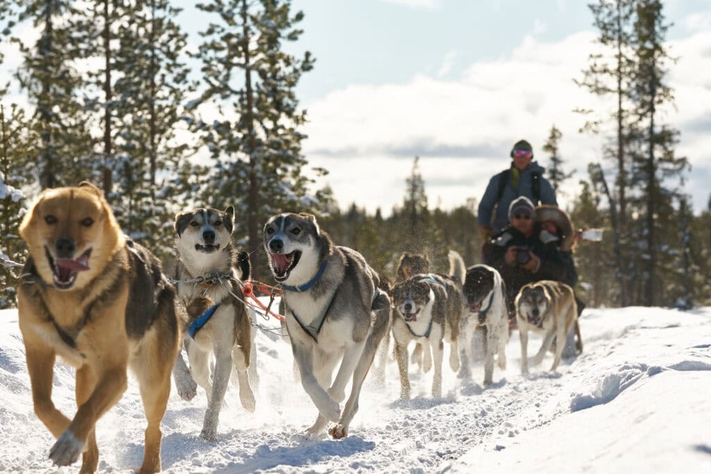Bequem im Schlitten sitzen, während das Huskyteam euch durch verschneite Täler trägt.