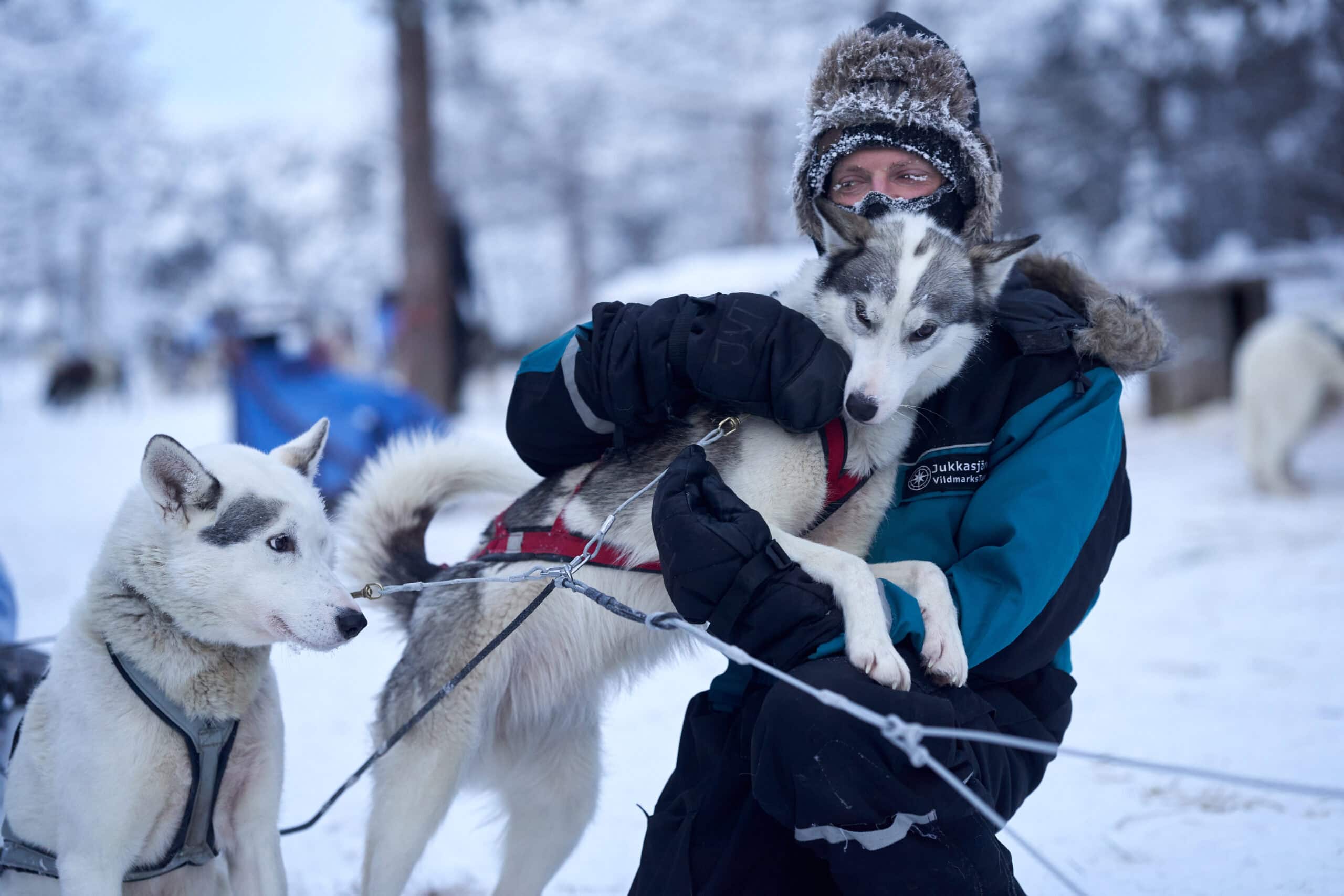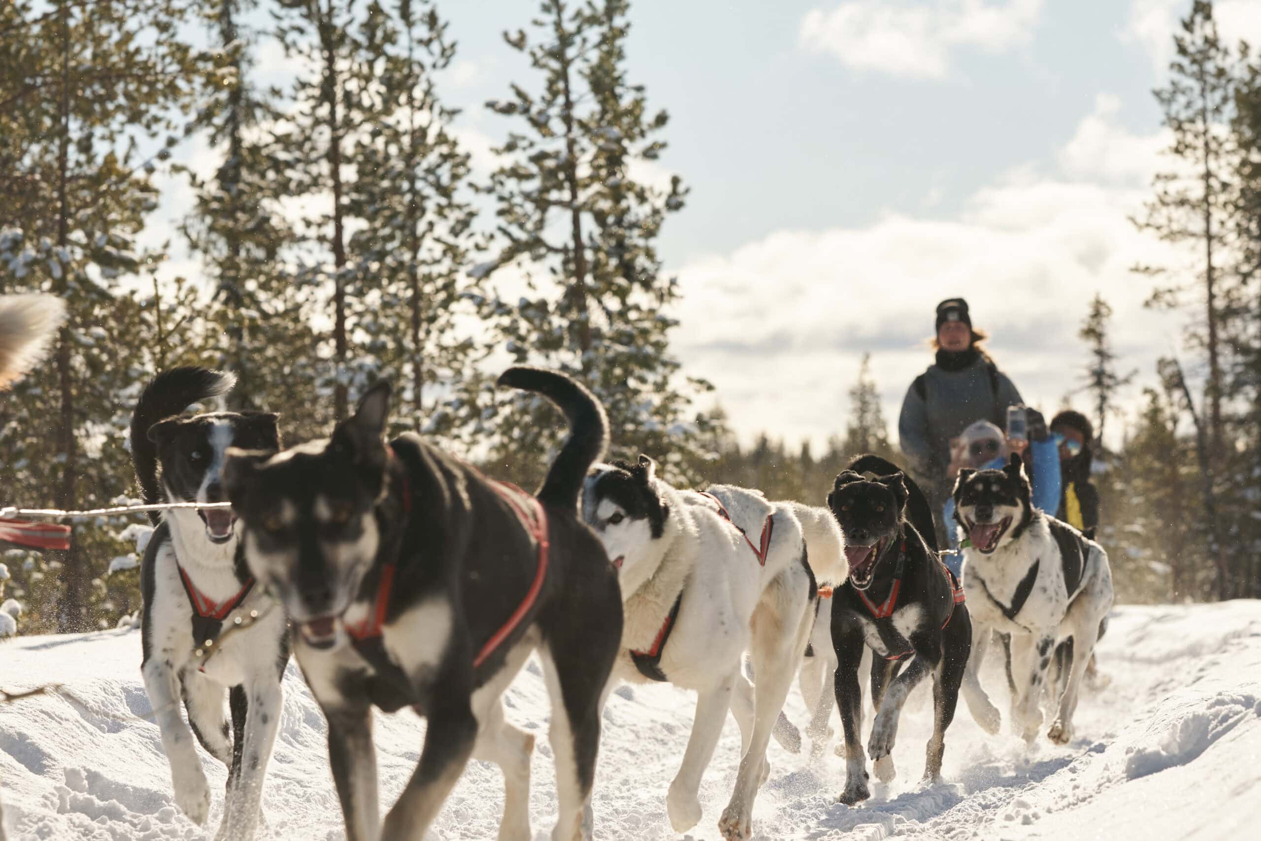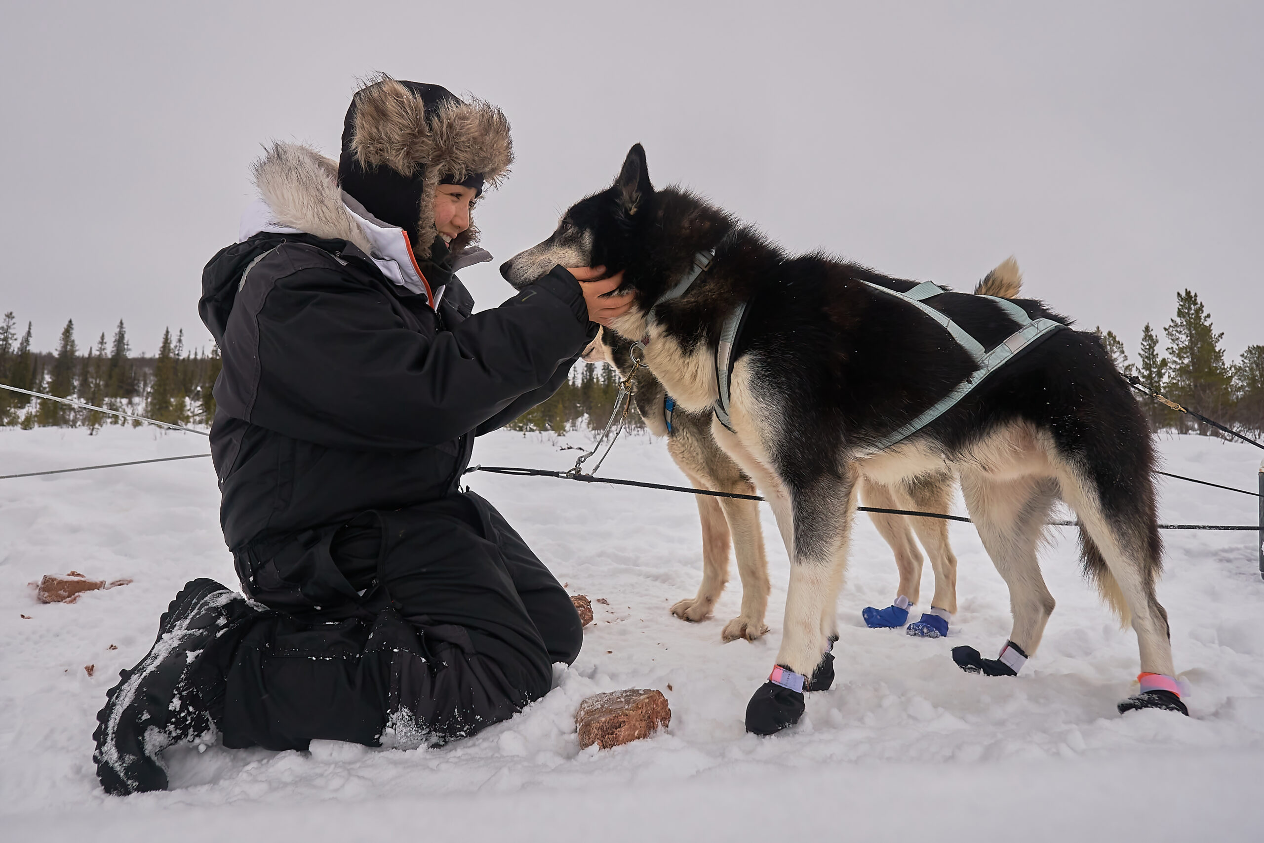Wir fahren gemächlich durch bewaldetes Gelände entlang eines Flusses – mit Blick auf die Berge – oder über einen etwa 5 km langen zugefrorenen See. Ein Team von 10–14 Hunden zieht Ihren Schlitten; pro Schlitten können bis zu vier Personen mitfahren. Auf halber Strecke machen wir eine Pause: Zeit, die Hunde zu knuddeln, am Feuer Tee, Kaffee oder heiße Schokolade zu trinken und Brot mit geschmolzenem Käse und Butter zu genießen. Am Ende der Tour bekommen die Hunde einen Snack und viele Streicheleinheiten.