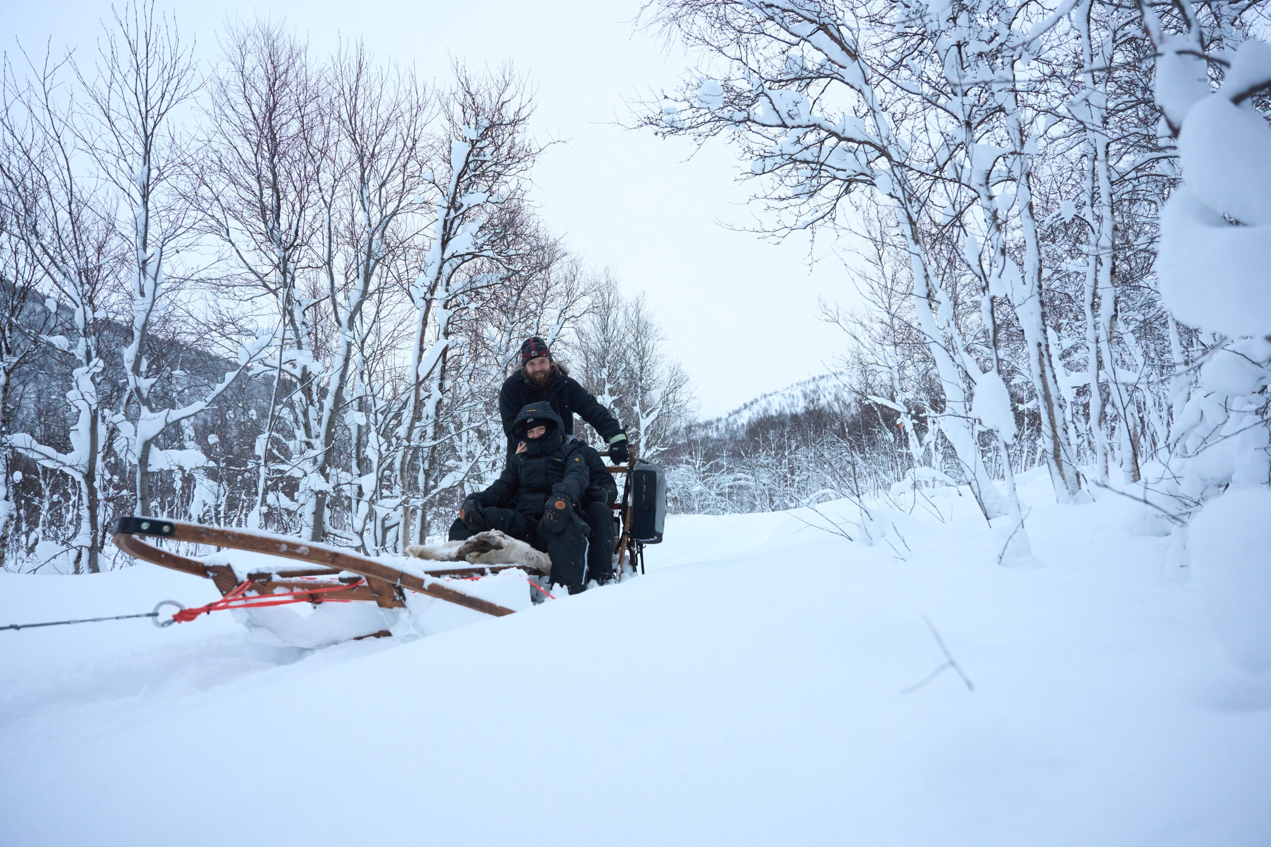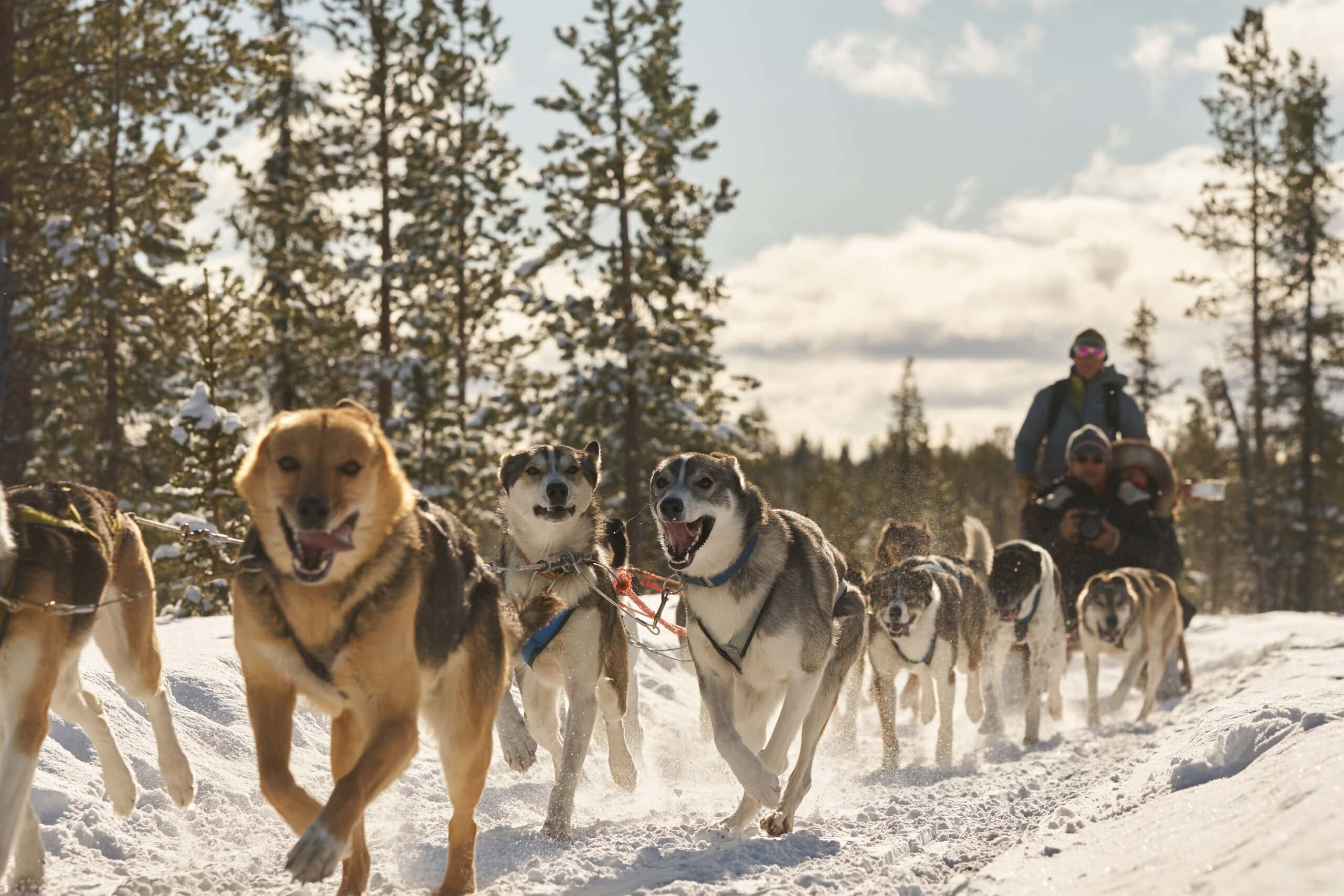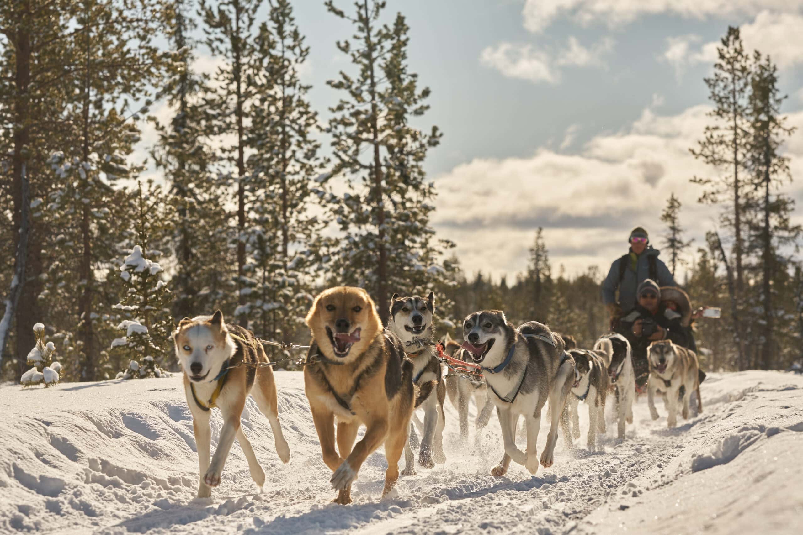 Wir fahren gemächlich durch bewaldetes Gelände entlang eines Flusses – mit Blick auf die Berge – oder über einen etwa 5 km langen zugefrorenen See. Ein Team von 10–14 Hunden zieht Ihren Schlitten; pro Schlitten können bis zu vier Personen mitfahren. Auf halber Strecke machen wir eine Pause: Zeit, die Hunde zu knuddeln, am Feuer Tee, Kaffee oder heiße Schokolade zu trinken und Brot mit geschmolzenem Käse und Butter zu genießen. Am Ende der Tour bekommen die Hunde einen Snack und viele Streicheleinheiten.