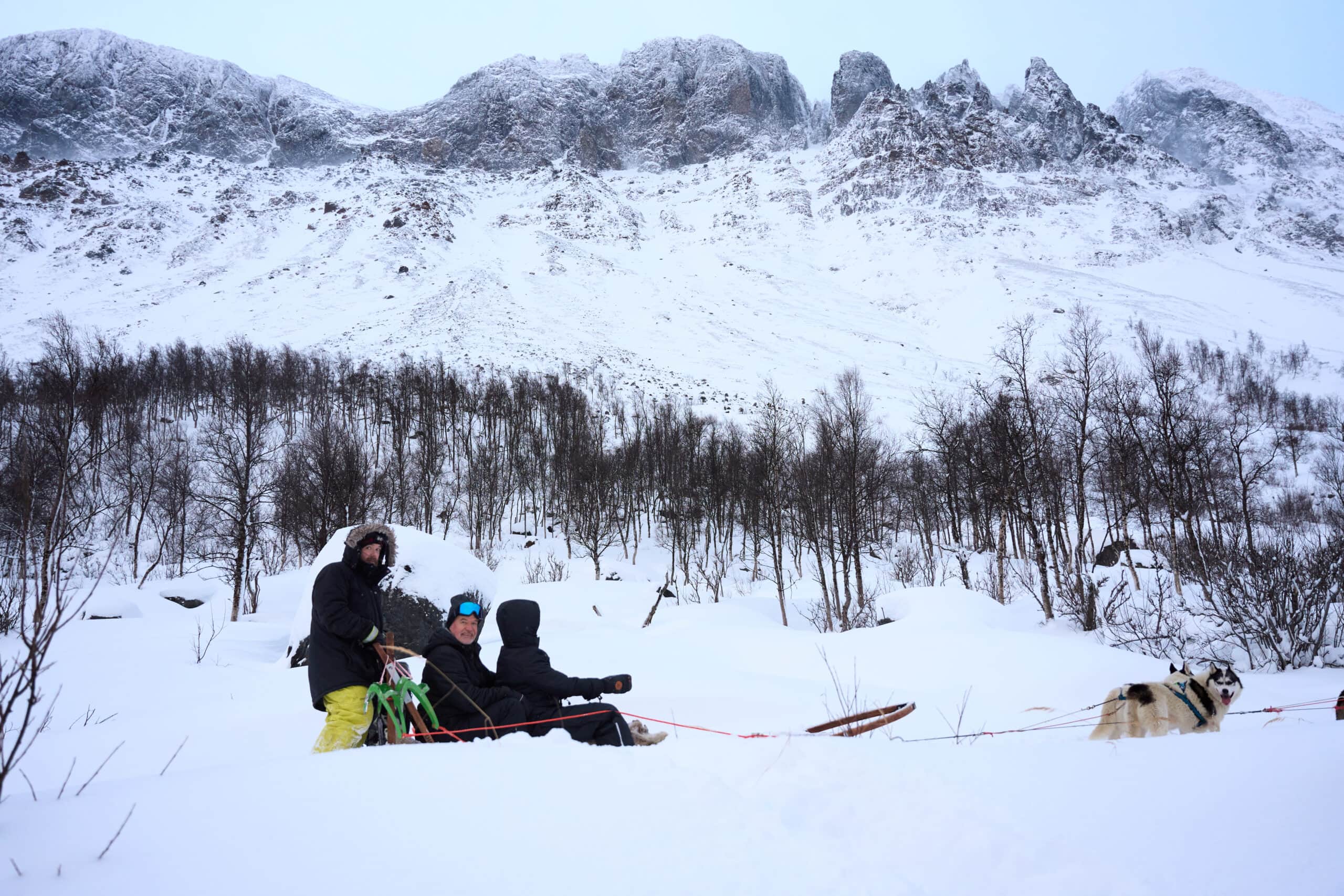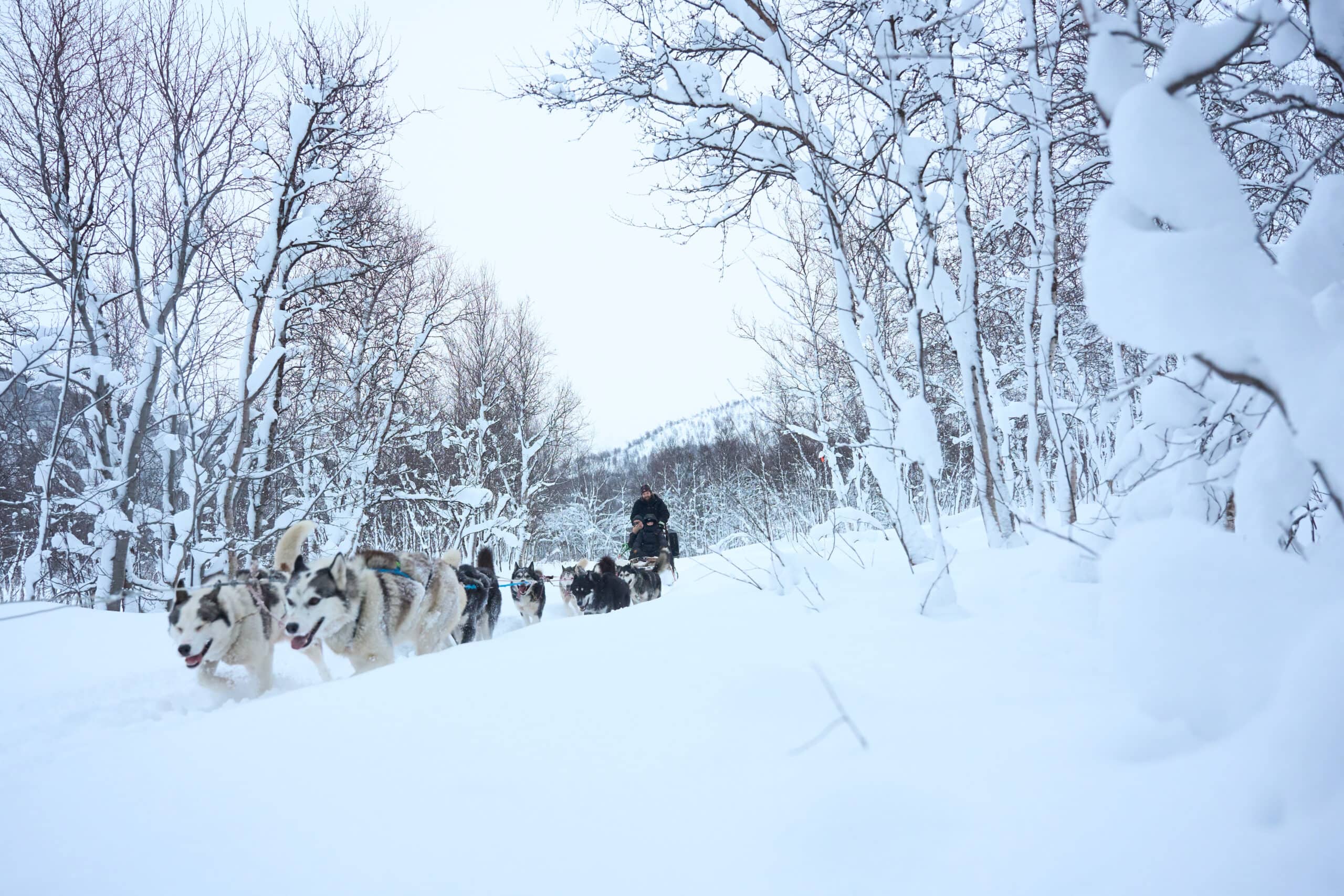 Bequem im Schlitten sitzen, während das Huskyteam euch durch verschneite Täler trägt.