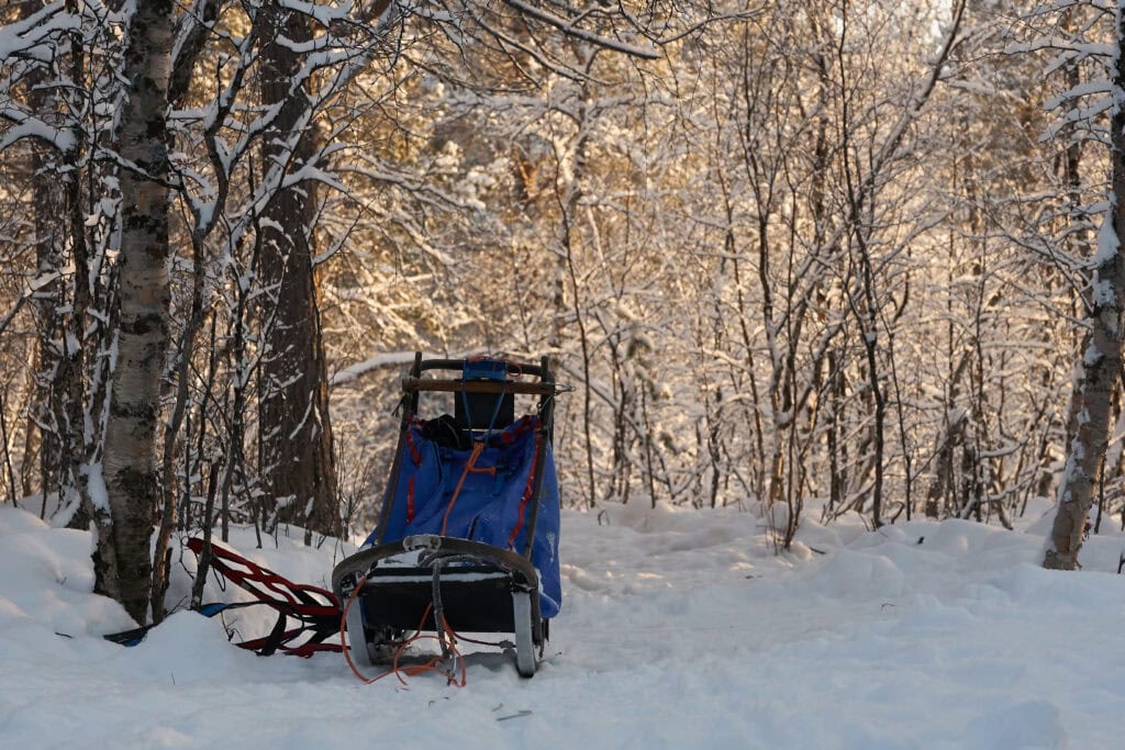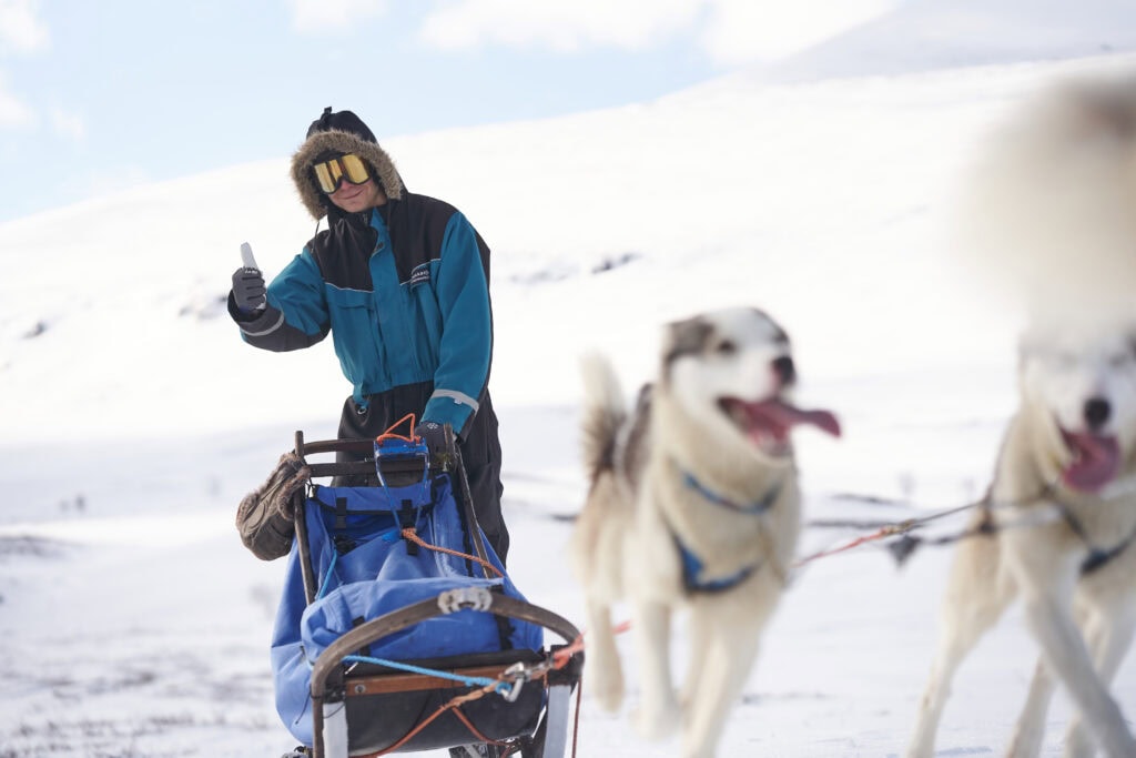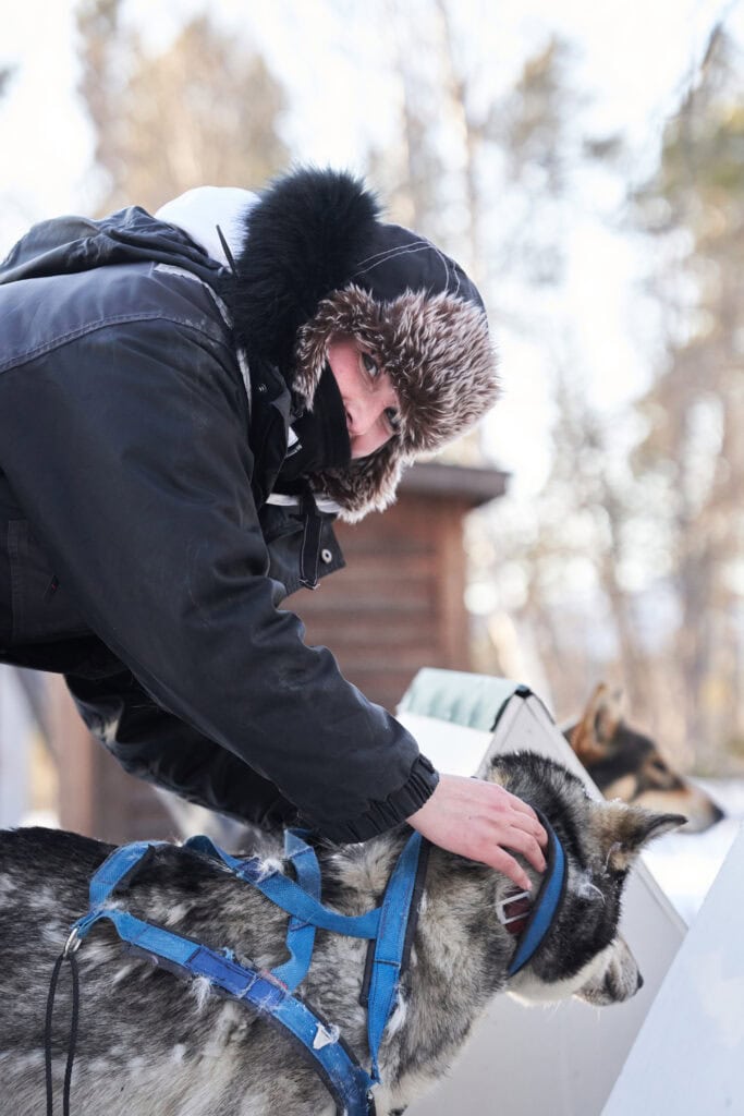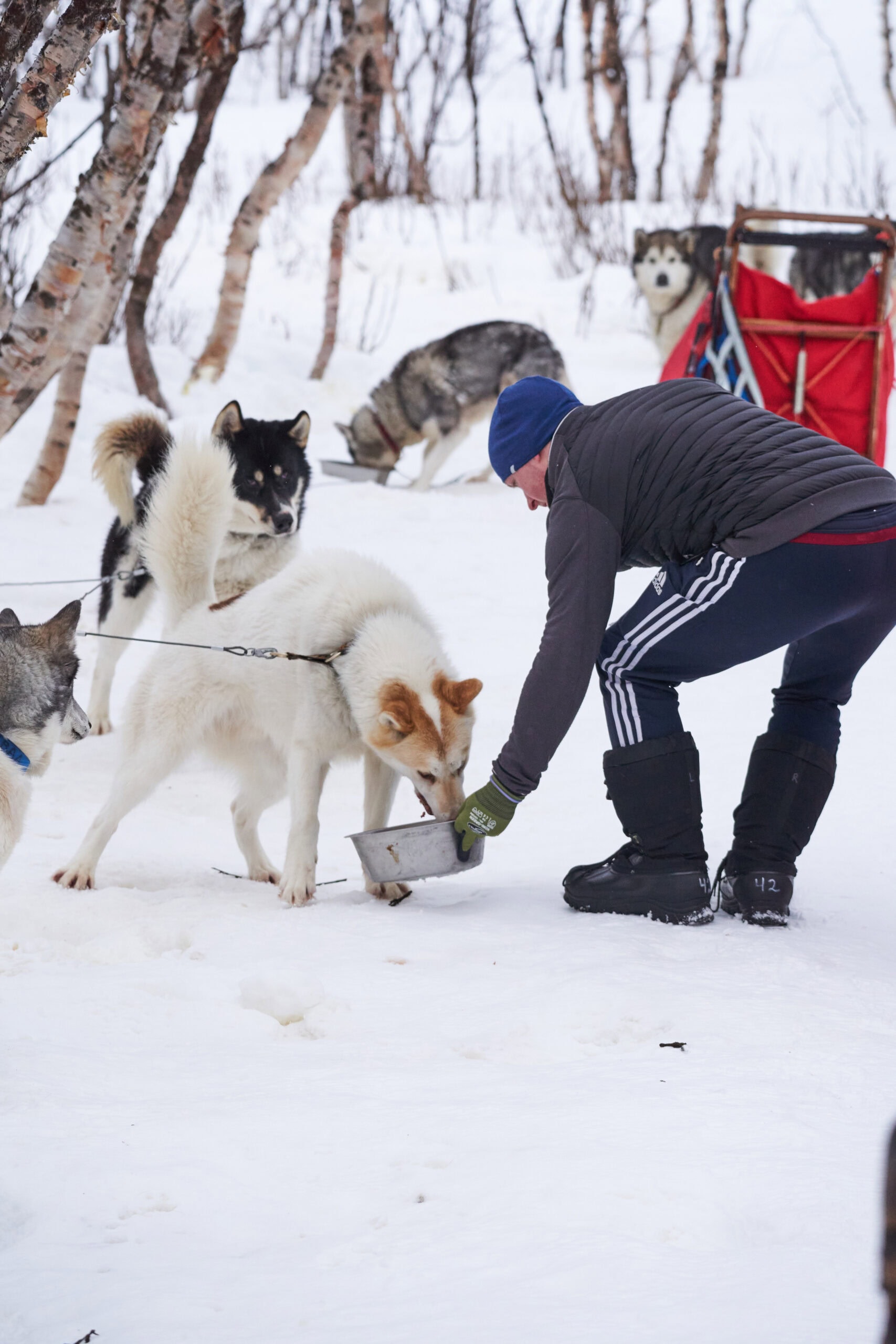 Am nächsten Morgen verladen wir die Hunde und unsere Ausrüstung und es geht endlich los. Wir fahren in den Reisa Nationalpark. Wir spannen unsere Hunde vor die Schlitten und auf geht’s ins Abenteuer. Am ersten Tag fahren wir immer tiefer in den Nationalpark hinein und finden unseren Platz an einer der einzigartigen Hütten.