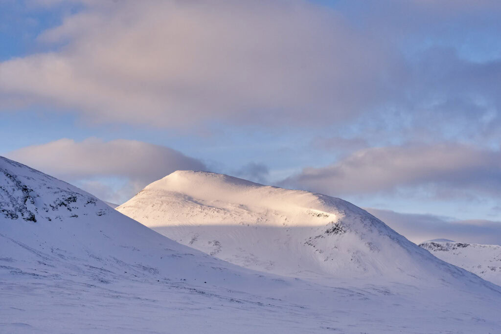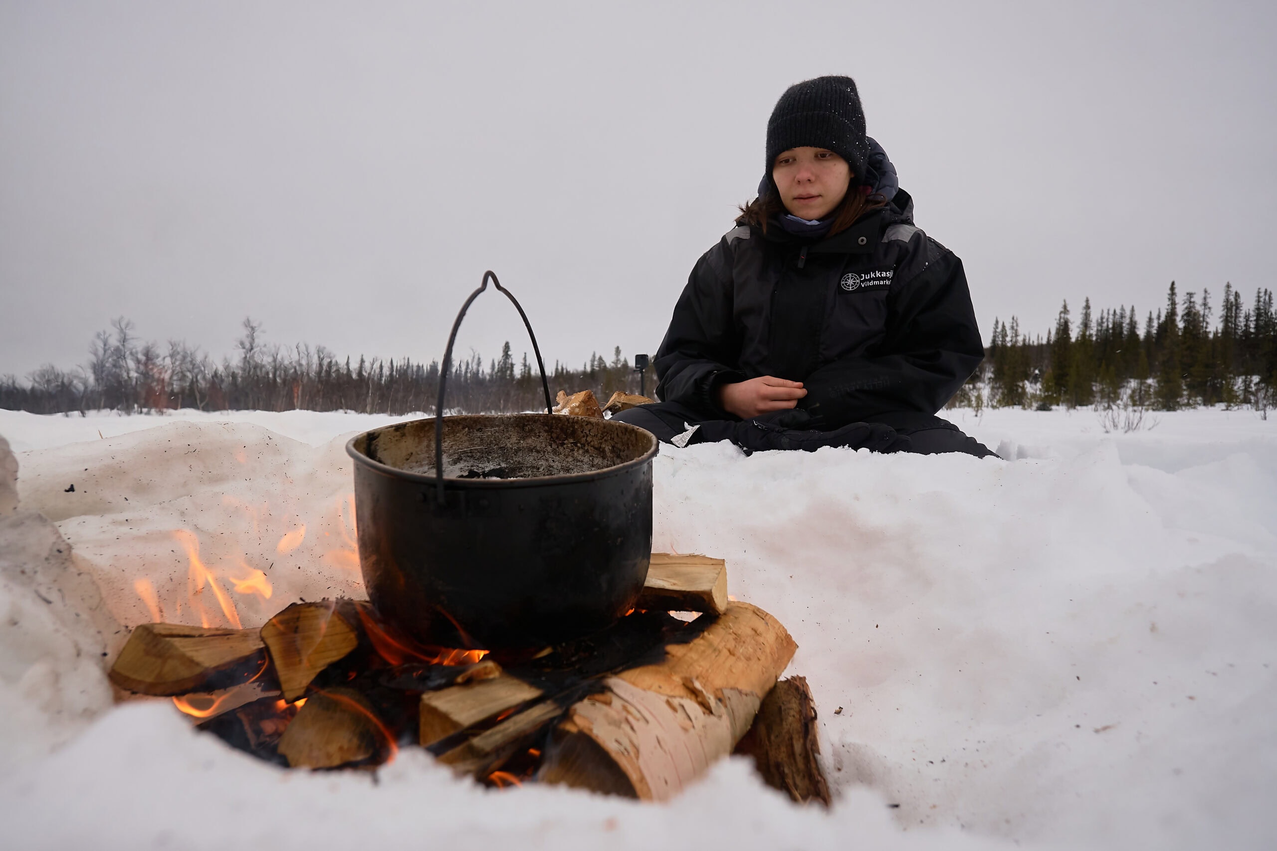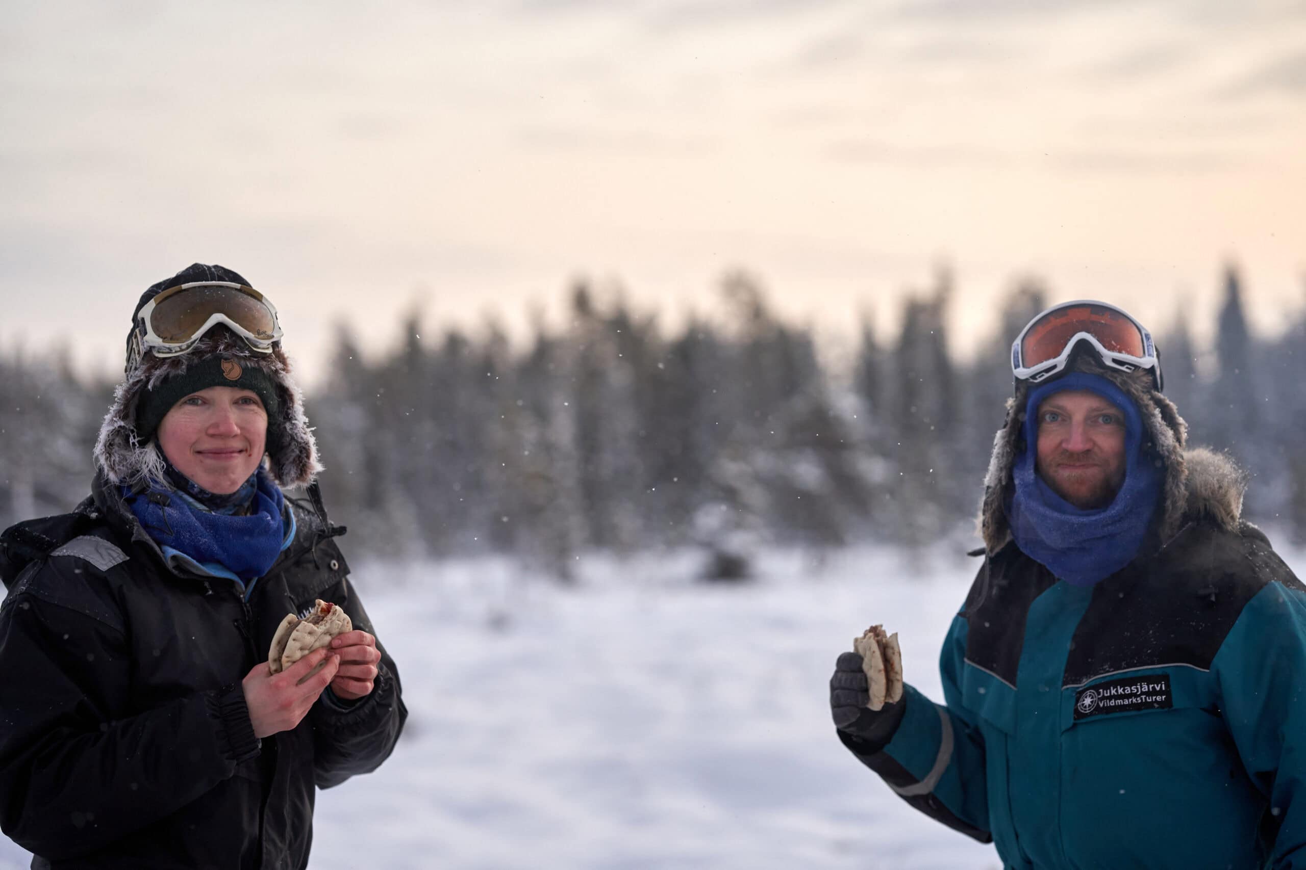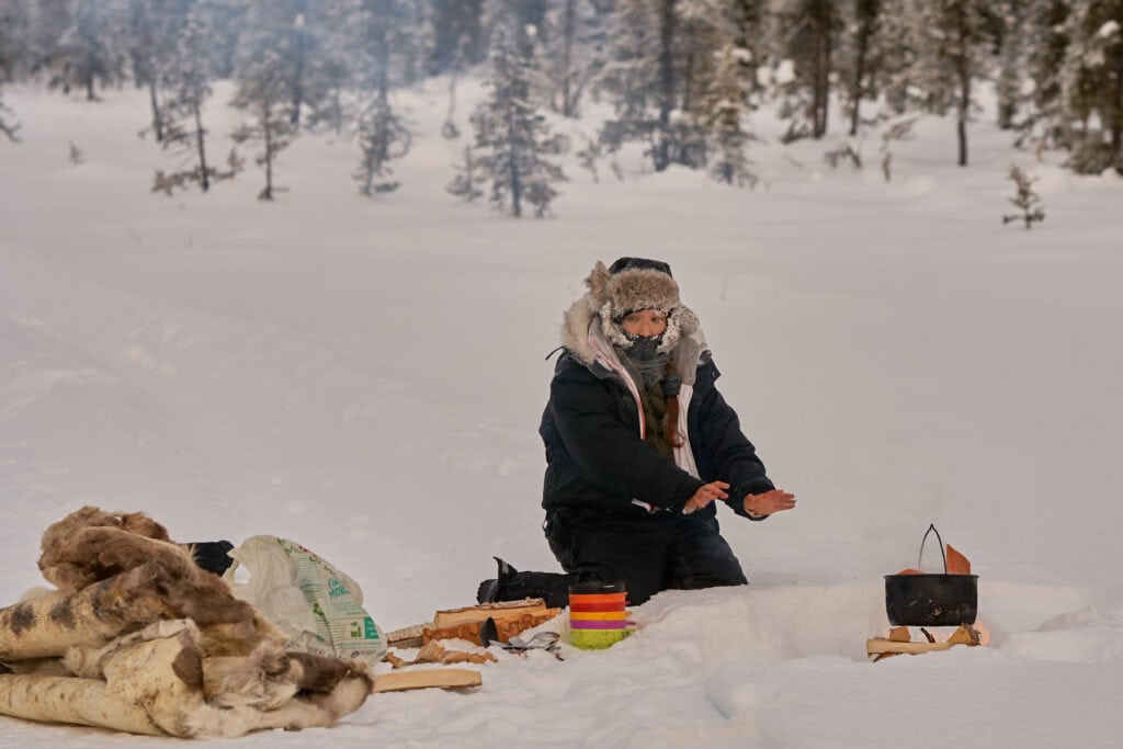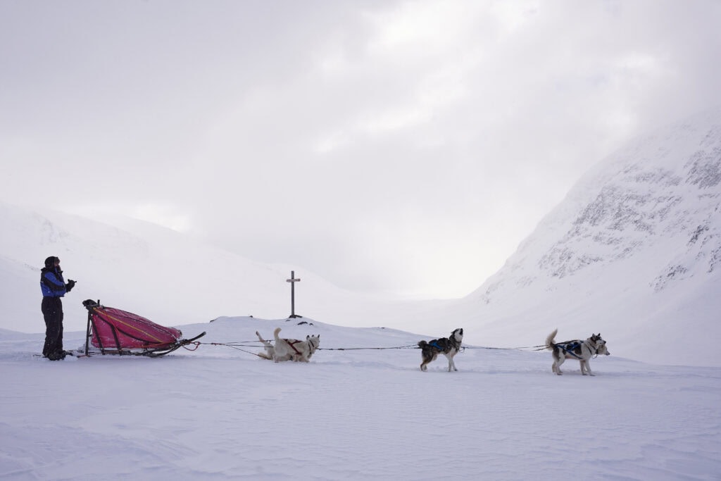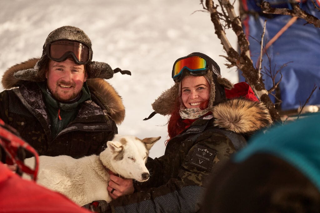 Von dort aus geht es wieder zurück in den Nationalpark. Wir fahren durch das tiefe Tal Richtung Nordwesten zu unserem nächsten Ziel. Immer weiter nach Norden führt uns unser Pfad zu einer Hütte, an der wir noch einmal den Komfort einer Hütte genießen, bevor wir die angrenzenden Berge mit unseren Huskys erklimmen und zu unserem Höhepunkt unseres Abenteuers kommen. Eine Nacht im Lavuzelt inmitten der Berge. Mit einem kleinen Ofen ausgestattet bauen wir das Zelt an einem schönen Platz auf und wärmen uns auf Rentierfellen am Ofen. Wir schlafen und essen alle gemeinsam in dem Zelt.