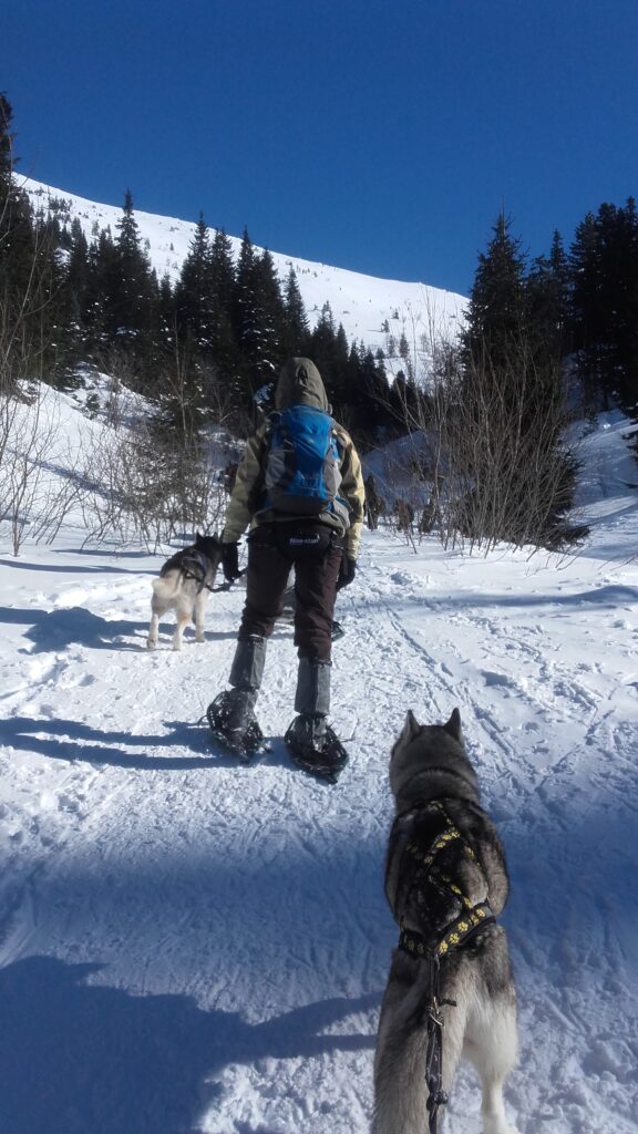 Erkunde die schönsten Plätze des Tals auf dem unberührten, glitzernden Schnee. Es gibt eine Möglichkeit, das Schneeschuhwandern noch besser zu machen: mit einem Husky. Wir befestigen unseren vierbeinigen Begleiter mit einem elastischen Seil an unserem Hüftgurt, und er zieht an seinem Geschirr, um uns beim Überqueren der Strecke zu helfen. Erkunden Sie die Wälder mit einem echten Entdecker des Nordens, der natürlich viele Streicheleinheiten braucht.
