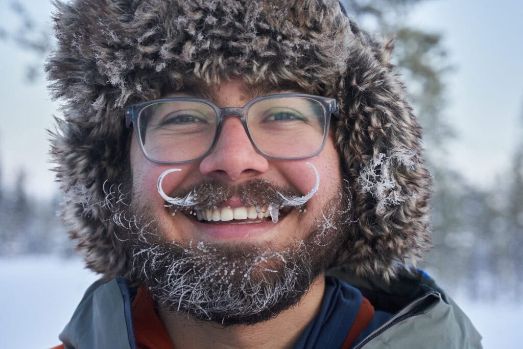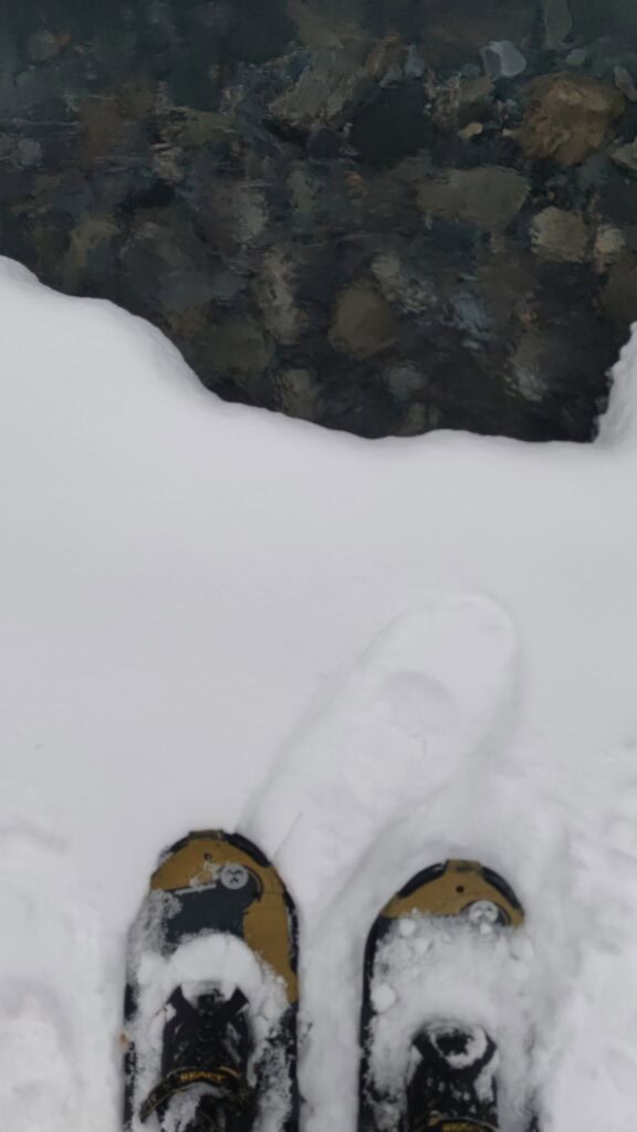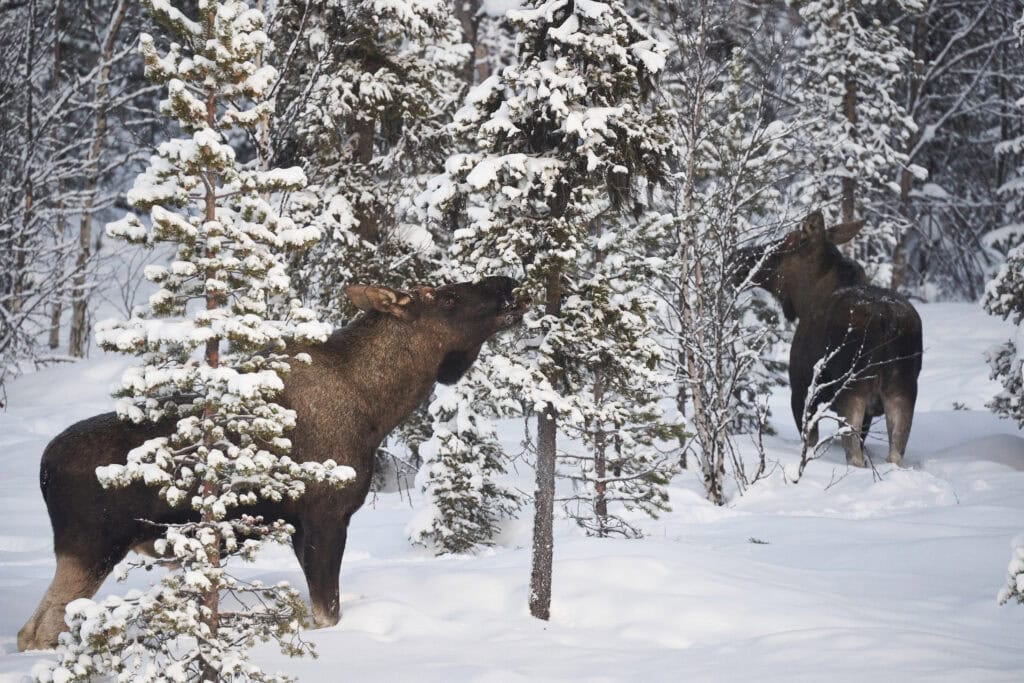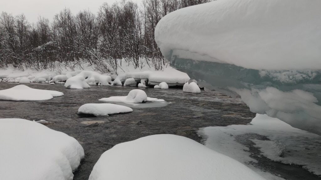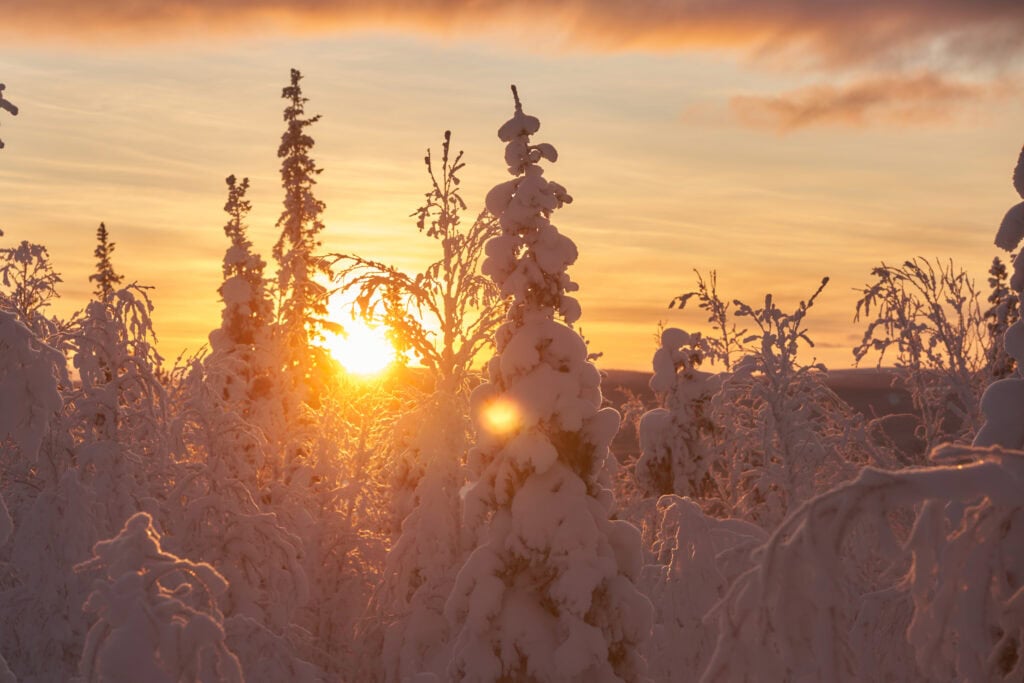 1 Meter tiefer Schnee, dichter verschneiter Wald in Lappland… Mit Schneeschuhen können wir tief in den Wald eindringen, wo noch nie jemand zuvor gewesen ist, wir können den Pfad betreten. Mit Schneeschuhen sinkt man nicht im Schnee ein und kann sich leichter fortbewegen, genau wie mit Skiern.