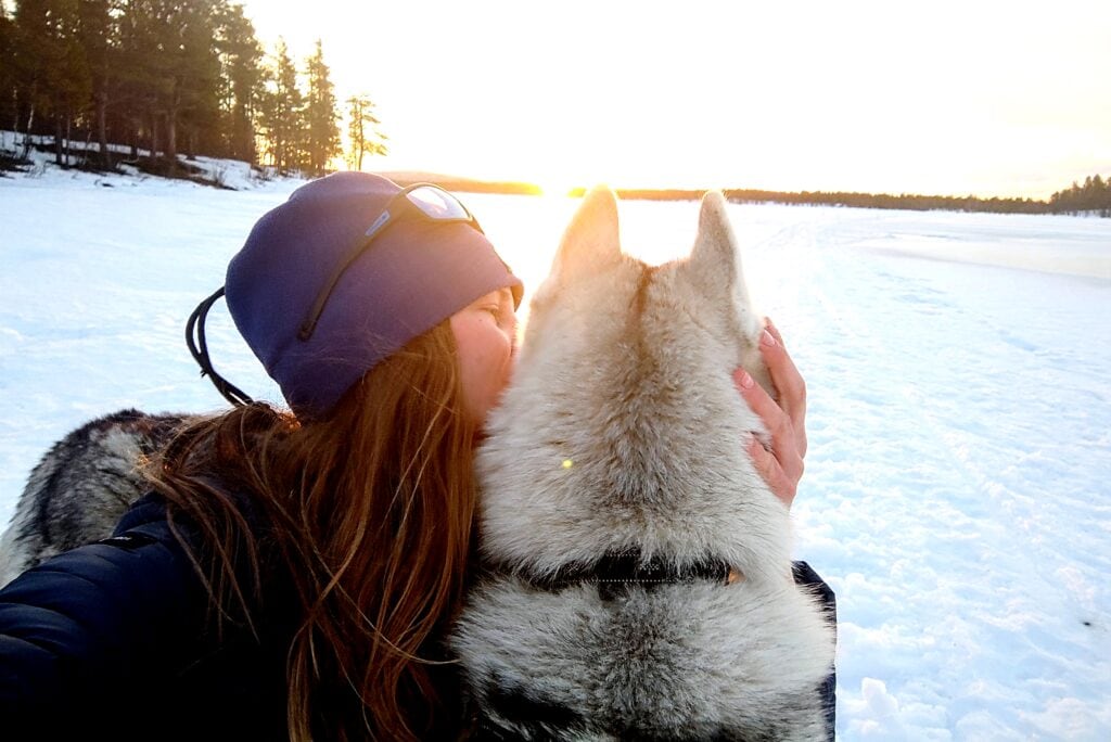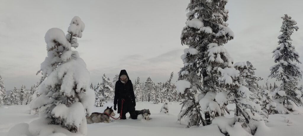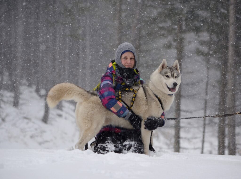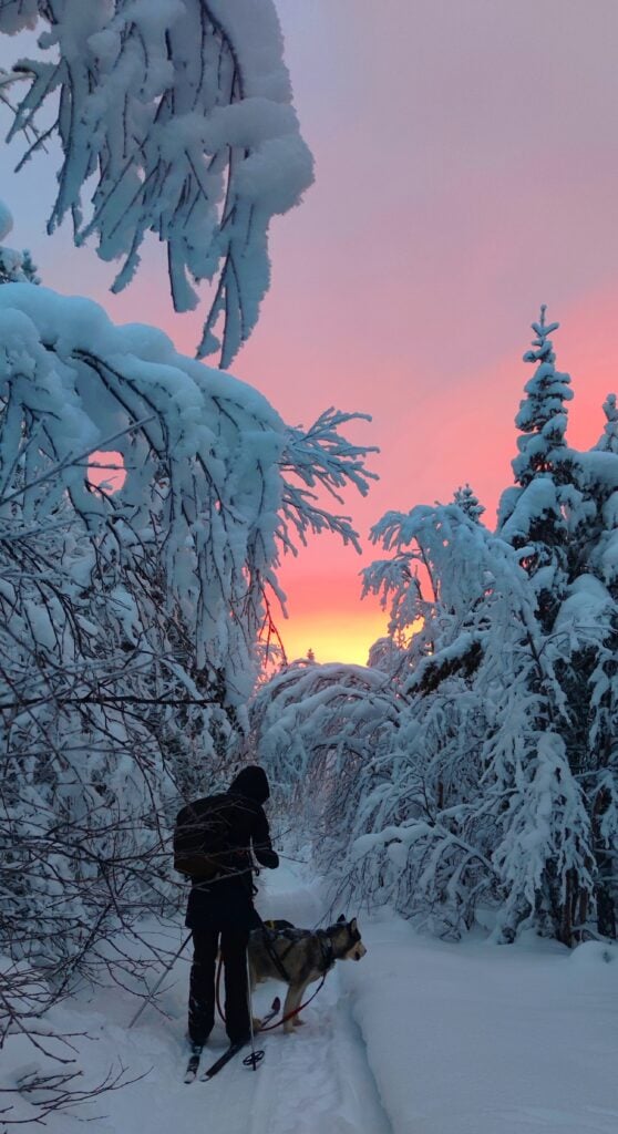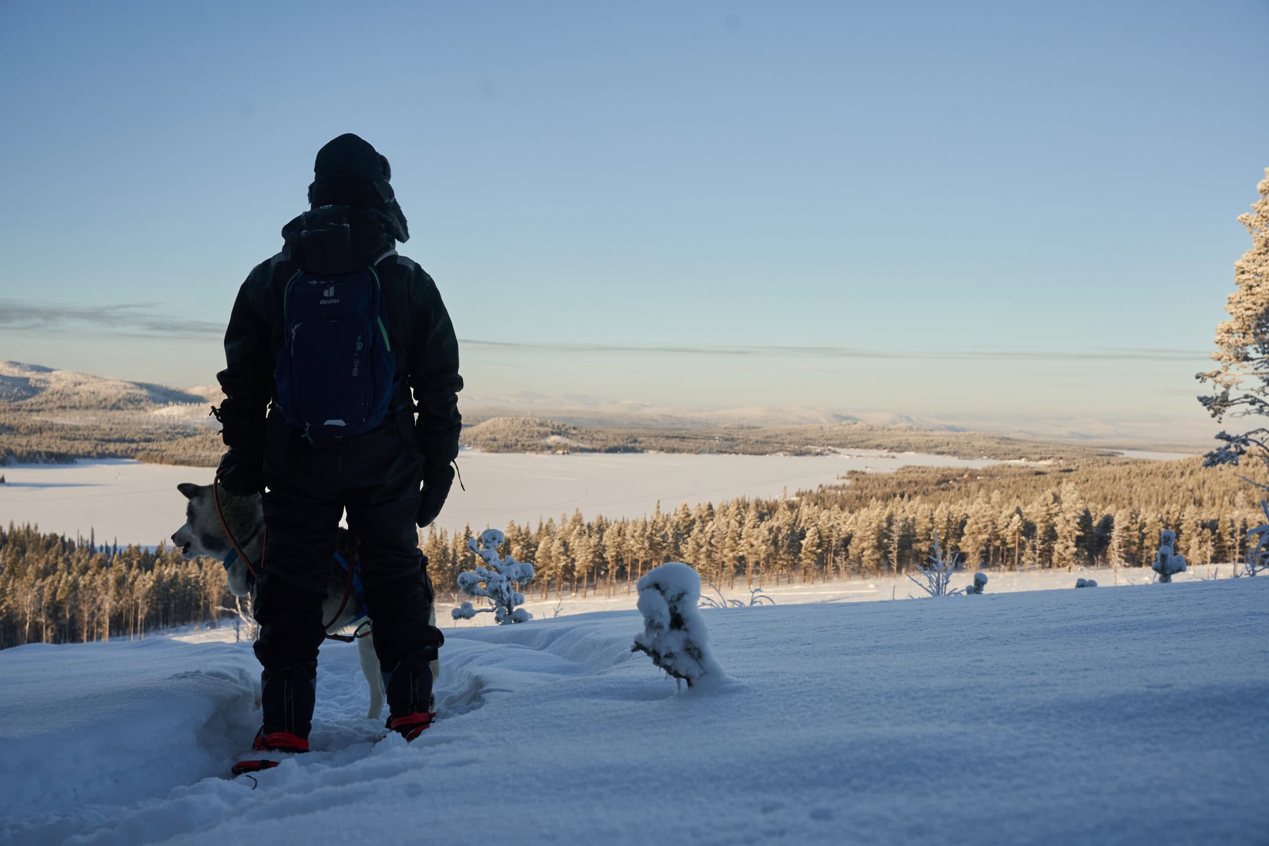 Mit einem Husky an der Seite lautlos durch den Winterwald stapfen und nordische Stille teilen.