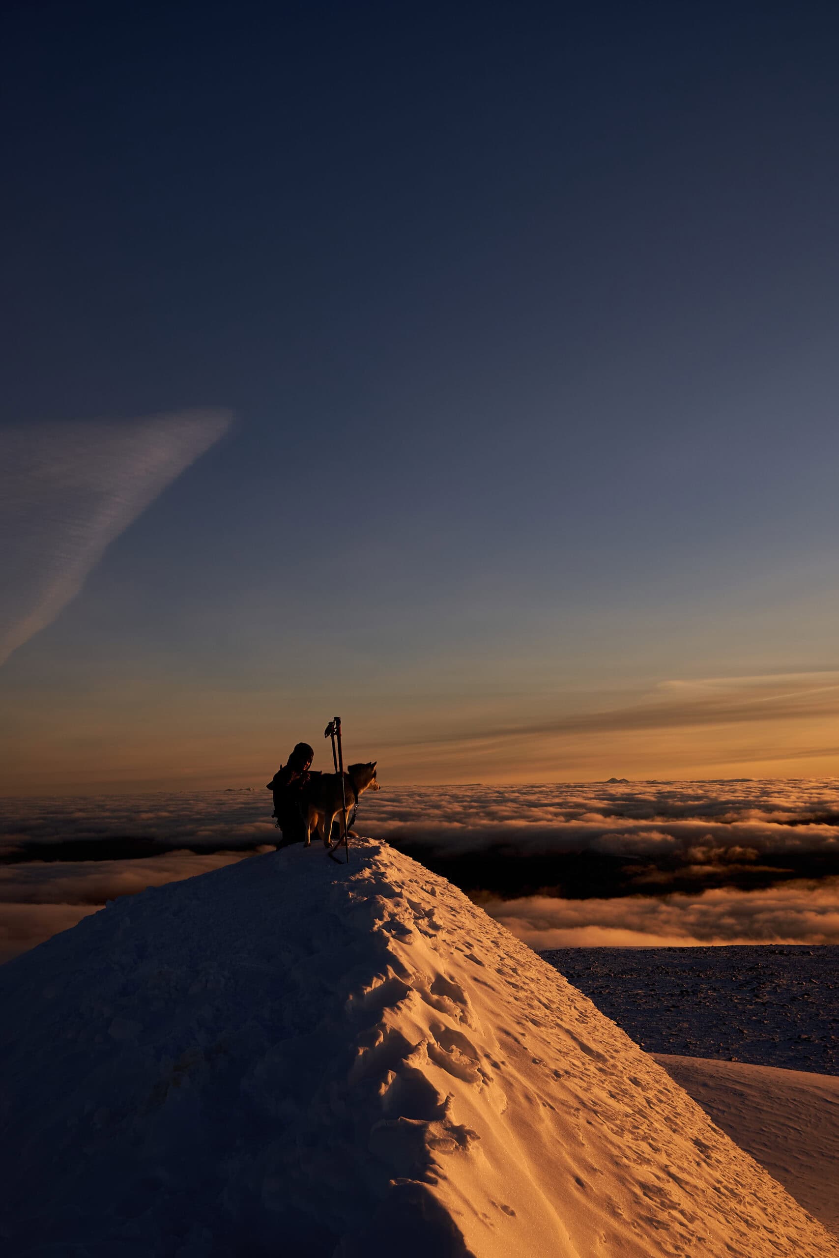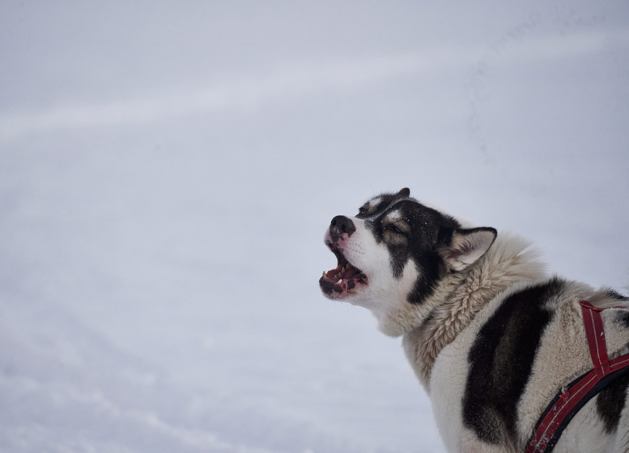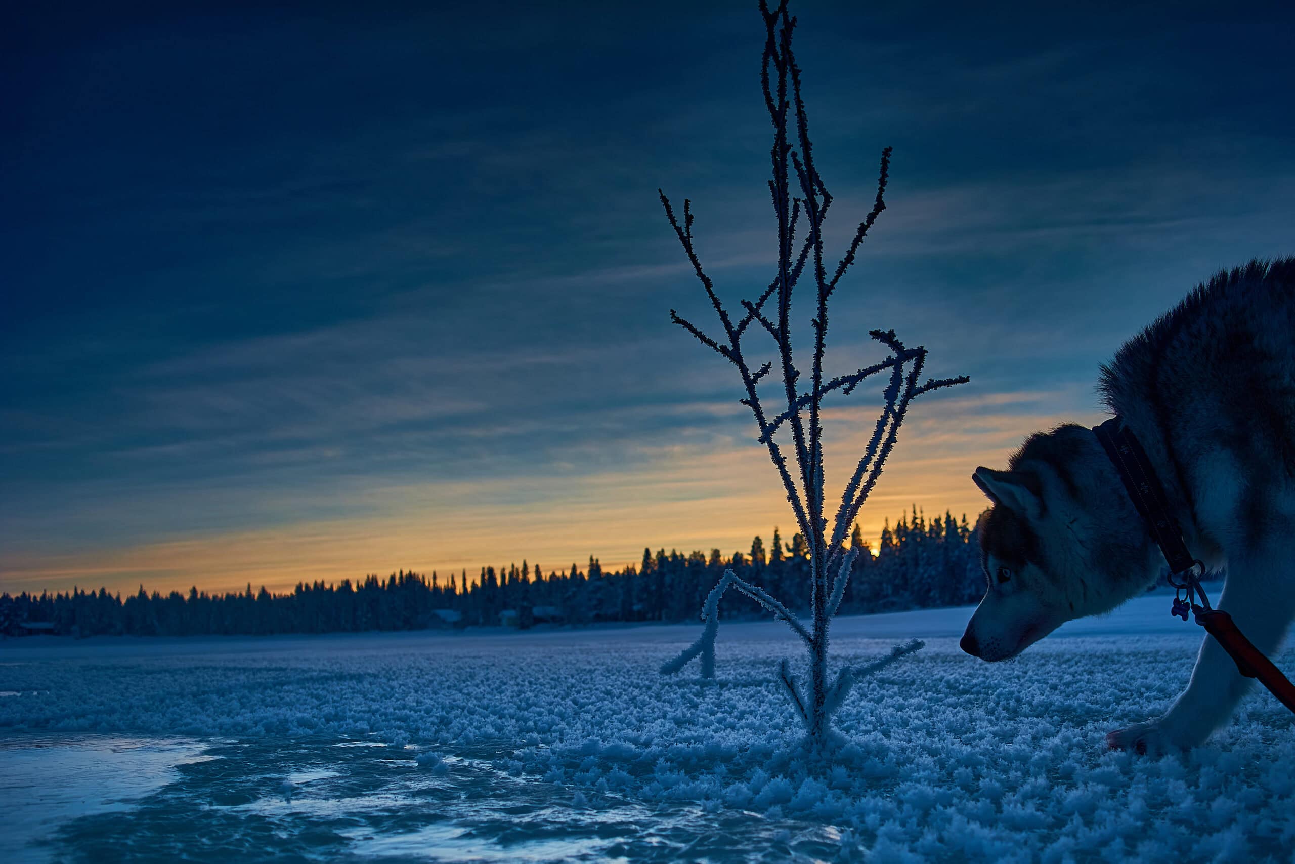 Mit einem Husky an der Seite lautlos durch den Winterwald stapfen und nordische Stille teilen.